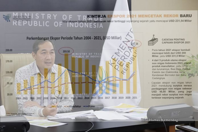 Besaran ini bahkan mengalahkan nilai ekspor tertinggi Indonesia yang selama ini dicatatkan pada 2011 sebesar USD 203,50 miliar. “Ekspor Indonesia di 2021 menembus angka USD 231,54 Miliar. Angka ini merupakan yang tertinggi, melampaui catatan nilai ekspor tertinggi Indonesia selama ini di 2011 yang sebesar USD 203,50 miliar,” ungkap Mendag Lutfi.