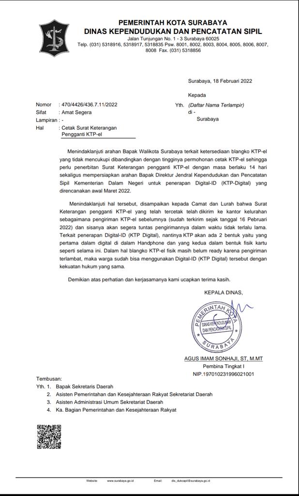 Berdasarkan surat edaran (SE) nomor 470/4426/436.7.11/2022 yang diterbitkan oleh Dispendukcapil Surabaya, Wali Kota Eri Cahyadi meminta Suket yang disediakan tersebut sebagai pengganti sementara KTP-el, masa berlakunya 14 hari hingga awal Maret 2022 mendatang.