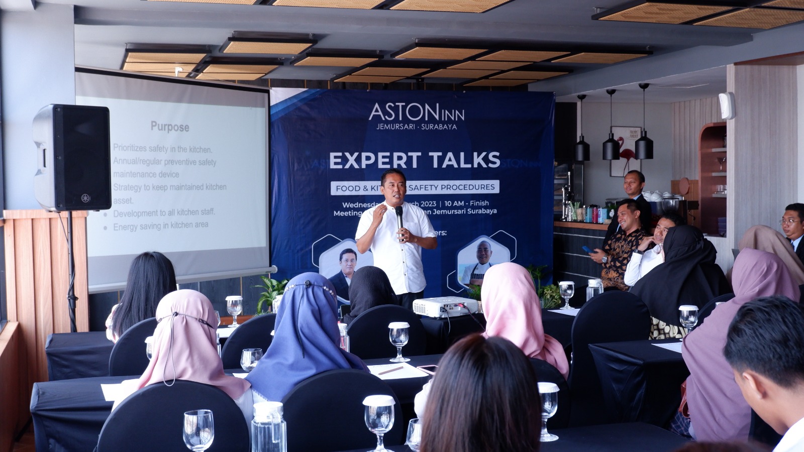 Dibuka Iwan Setiawan selaku General Manager Aston inn Jemursari, acara yang dikemas ringan namun sarat dengan pengetahuan seputar Food & Beverage, khususnya Kitchen dan Kitchen Safety ini juga diselingi sesi tanya jawab oleh peserta kepada narasumber.