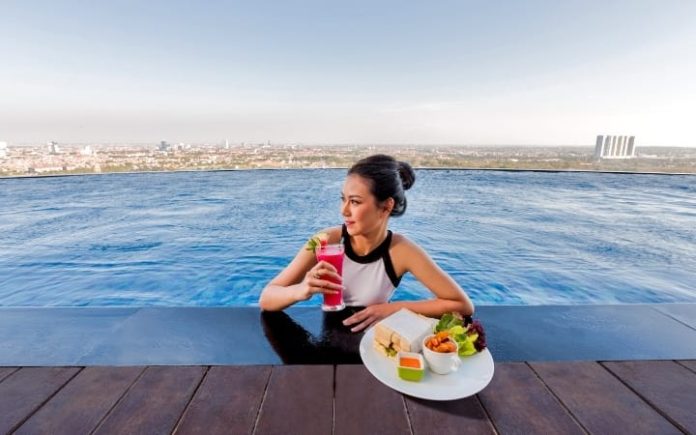 Berenang dengan pemandangan cantik kota Surabaya Para tamu bisa berenang di Infinity Pool dengan pemandangan cantik kota Surabaya baik di pagi atau sore hari. Dengan Infinity Pool yang luas, Anda dapat berenang, bersantai, hingga menikmati gemerlap lampu kota di malam hari. Disamping Infinity Pool, terdapat jacuzzi yang siap membantu meregangkan dan menenangkan otot-otot. Anda juga dapat memelihara kesehatan tubuh melalui olahraga di gym dan sauna.