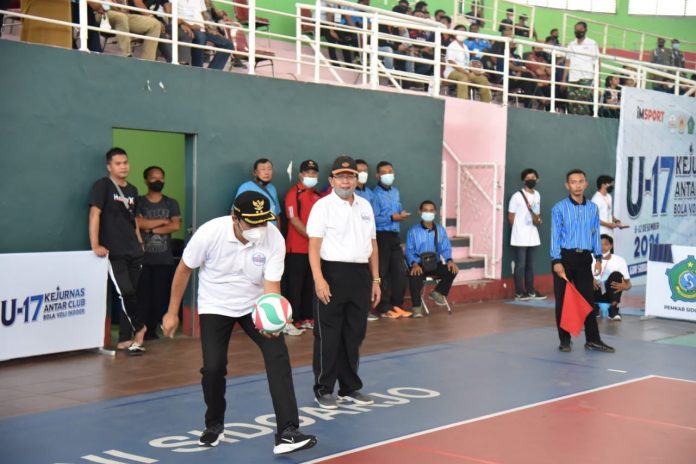 Kejurnas antar club bola voli indoor U17 dibuka langsung oleh Ketua PBVSI Pusat Imam Soedjarwo di Gedung Serbaguna GOR Sidoarjo, Senin, (6/12). Wakil Bupati Sidoarjo H. Subandi SH, hadir dalam kesempatan tersebut.