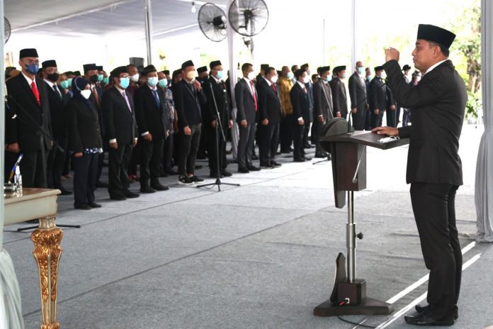 Surabaya, (pawartajatim.com) – Penghujung 2021, Wali Kota Surabaya Eri Cahyadi, menggelar pelantikan massal pejabat di lingkungan Pemerintah Kota/Pemkot Surabaya, Jumat (31/12). Pelantikan pejabat itu dilakukan di Halaman Taman Surya, Balai Kota Surabaya.