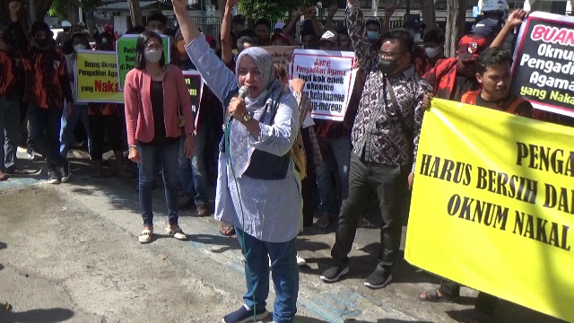 Massa menggelar aksi di Kantor Pengadilan Agama Banyuwangi, Jumat (17/6). (foto/udi)
