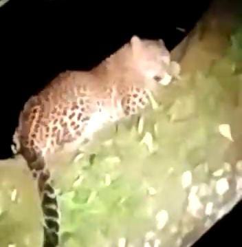 Begitu disorot dengan lampu senter, ternyata ada seekor macan tutul di atas pohon. Warga akhirnya merekamnya beberapa menit. Karena takut, warga memilih mematikan lampu senter.