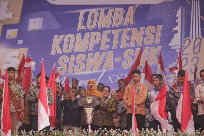 Surabaya, (pawartajatim.com) – Gubernur Jawa Timur/Jatim, Khofifah Indar Parawansa, membuka langsung Lomba Kompetensi Siswa Sekolah Menengah Kejuruan (LKS SMK) XXXI Tingkat Nasional 2023 di Airlangga Convention Center (ACC) Surabaya, Selasa (24/10/2023).