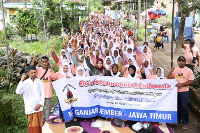 Jember, (pawartajatim.com) – Ratusan emak-emak yang berjejaring dalam relawan Mak Ganjar Jawa Timur/Jatim menggelar ‘Doa bersama untuk Indonesia’ di Dusun Langon, Desa Ambulu, Kecamatan Ambulu, Kabupaten Jember. Intensi doa untuk kebaikan dan kemajuan bangsa Indonesia.