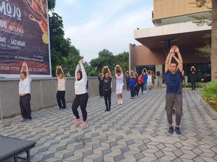 Untuk itu, salah satu cara untuk memberikan motivasi lebih dan juga sebagai sarana berkumpul dan menyehatkan diri diadakan Senam Bersama di area parkir hotel yang terletak di Jalan Totok Kerot no 51, bypass Mojokerto Jum’at (2/6).