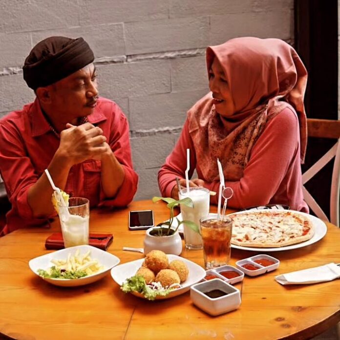 Nanang Sutrisno (kiri) bersama istri sedang bercengkrama saat berlibur di Cafe Bantimurung Hotel Best Western Papilio. (foto/arief)