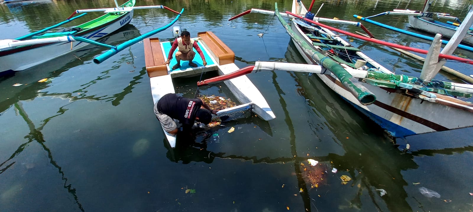 “Perahu sampah ini kami buat sendiri. Nilainya Rp 19 juta. Ini sangat membantu untuk membersihkan sampah muara,” jelas pria asli Kampung Mandar ini. Perahu sampah ini digerakkan dengan mesin tempel. Bahannya terbuat dari fiber.
