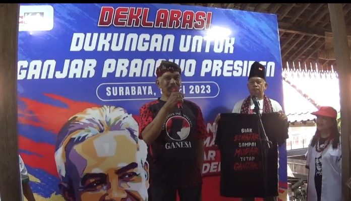 Surabaya, (pawartajatim.com) – Ratusan pendukung dan simpatisan Ganjar Pranowo di Surabaya dan sekitarnya yang tergabung dalam Jaringan Arek Ksatria Airlangga (JAKA) menggelar deklarasi dukungan untuk Ganjar Pranowo sebagai Calon Presiden (Capres) RI 2024-2029 di Surabaya, Jumat (5/5).