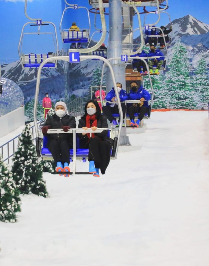 Usai peresmian, Gubernur Khofifah didampingi Founder dan CEO CT Corp Chairul Tanjung berkeliling meninjau gerai-gerai yang ada di Trans Icon, salah satunya di Trans Snow World.
