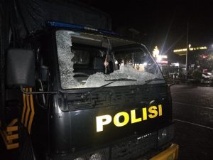 Sal;ah satu truk polisi jadi sasaran amuk masa saat pertandingan Arema FC vs Persebaya di Lapangan Kanjuruhan Malang yang berakhir rusuh dengan memakan korban 129 orang tewas Sabtu (1/10). (foto/ist)