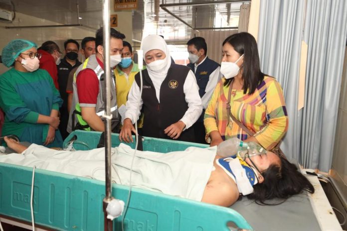 Malang, (pawartajatim.com) – Insiden kerusuhan yang menewaskan 129 orang supporter (data per 09.30 WIB) dalam laga Derby Jatim antara Arema FC vs Persebaya di Stadion Kanjuruhan, Malang, Sabtu (1/10/) membuat miris semua orang. Karena itu, Gubernur Jawa Timur/Jatim, Khofifah Indar Parawansa, berbegas ke rumah sakit di Malang menengok korban luka-luka yang dirawat
