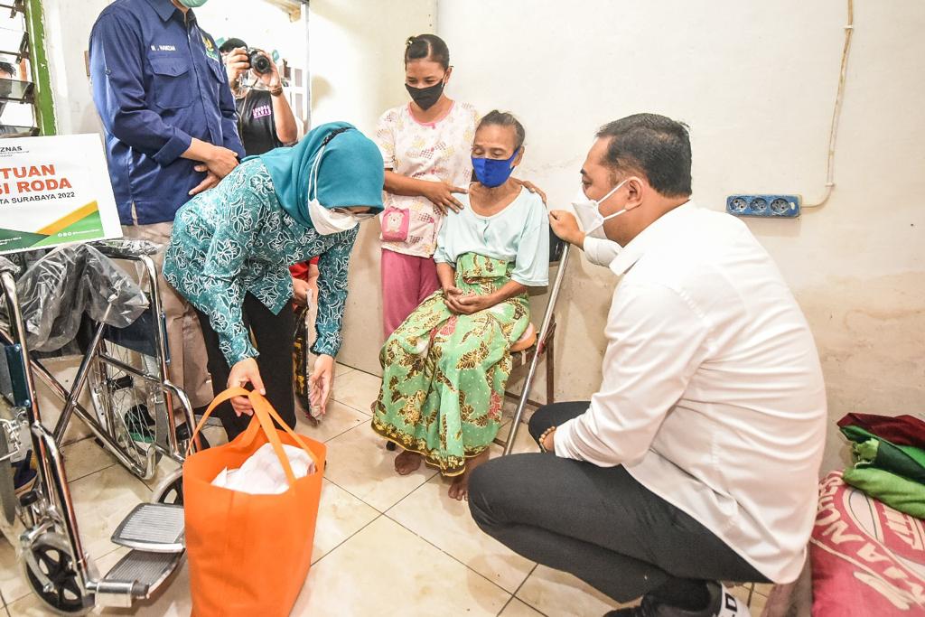 Wali Kota Surabaya Eri Cahyadi, beserta Ketua Tim Penggerak (TP) PKK Kota Surabaya, Rini Indriyani dan Pengurus Baznas, terjun langsung membagikan kursi roda kepada sejumlah warga penerima di Kampung Keputran Kejambon dan Panjunan, Kelurahan Embong Kaliasin, Kecamatan Genteng Surabaya.