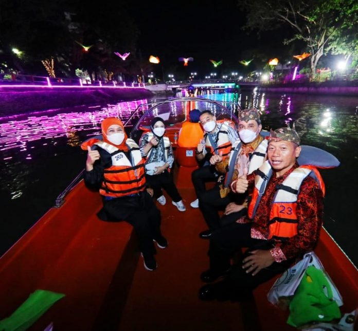 Tampilan istimewa itu menjadi hiburan tersendiri bagi Gubernur Jawa Timur Khofifah Indar Parawansa yang sibuk memimpin rapat di gazebo halaman Gedung Negara Grahadi Surabaya. Sebab malam ini, Gubernur Khofifah diajak Wali Kota Surabaya Eri Cahyadi, menyusuri Sungai Kalimas menggunakan perahu bersama tamu undangan lainnya.