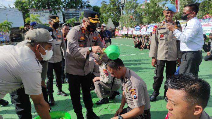 Personel Polresta Banyuwangi disiram air bunga dalam ritual kenaikan pangkat, Senin (4/7) pagi. (foto/udi)