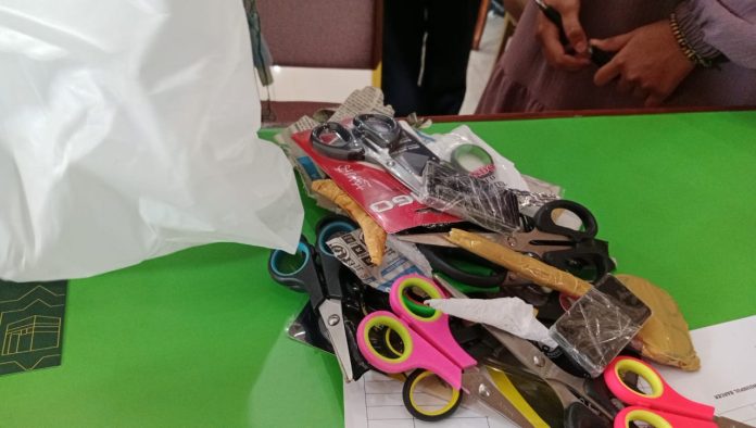 Surabaya, (pawartajatim.com) – Puluhan gunting dan pisau disita Panitia Penyelenggara Ibadah Haji (PPIH) Embarkasi Surabaya dari sejumlah koper milik jemaah calon haji di Asrama Haji Embarkasi Surabaya (AHES). Barang-barang berbahaya tersebut ditemukan petugas saat pemeriksaan menggunakan mesin x-ray, sebelum para jemaah meninggalkan Asrama Haji menuju Tanah Suci.