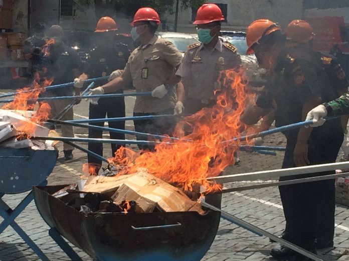 Dalam kegiatan tersebut, dilakukan pemusnahan dengan cara pembakaran terhadap rokok ilegal dan penghancuran terhadap handphone dominan Apple versi terbaru dengan cara dipukul pakai palu secara simbolis sedangkan sisanya dilakukan di Perusahaan Pengolahan Limbah Organik dan Non Organik PT Hijau Alam Nusantara yang berlokasi di Desa Ngoro Kabupaten Mojokerto.