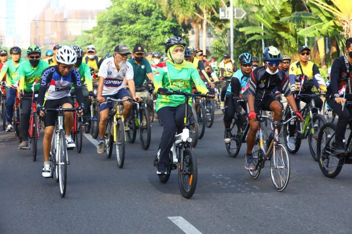 Surabaya, (pawartajatim.com) – Sekitar dua puluh ribu masyarakat dari berbagai daerah dan komunitas di Jawa Timur/Jatim memadati sepanjang Jalan Gubernur Suryo, Minggu (31/7) pagi. Mereka tampak begitu antusias mengikuti Gowes Bareng Gubernur Jawa Timur dalam rangka memperingati 1 Muharram 1444 Hijriyah.