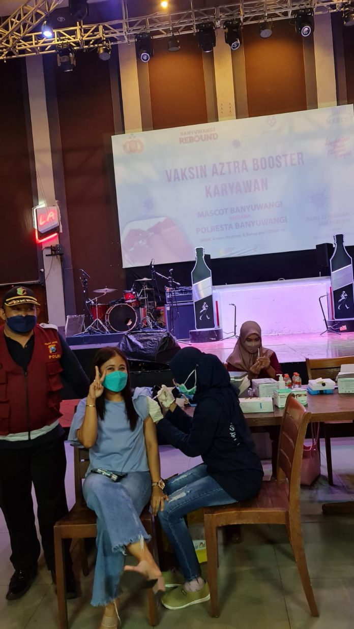Banyuwangi, (pawartajatim.com) – Vaksinasi di Banyuwangi terus diperluas, menyasar berbagai kalangan. Terbaru, serbuan vaksinasi menyasar para karyawan tempat hiburan. Salah satunya, rumah karaoke keluarga. Vaksinasi dilakukan Seksi Kedokteran dan Kesehatan/Dokkes Polresta Banyuwangi.