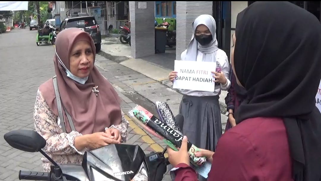 IPM SMP Muhammadiyah 4 Surabaya mengadakan kegiatan berbagi kebaikan ini dengan berkumpul di pinggir jalan dan mencari orang bernama Fitri. Setelah dicek identitasnya, kami beri kado atau hadiah berupa hijab atau kerudung dengan memilih sendiri sesuai selera mereka.