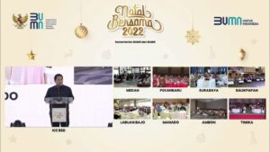 Surabaya, (pawartajatim.com) – Kementerian BUMN menyelenggarakan perayaan Natal bersama dengan jajarannya. Perayaan dilaksanakan di Indonesia Convention Exhibition (ICE) BSD, Tangerang dan diikuti secara hybrid di delapan lokasi lainnya yakni, Medan, Pekanbaru, Surabaya, Balikpapan, Ambon, Labuan Bajo, Manado dan Timika.