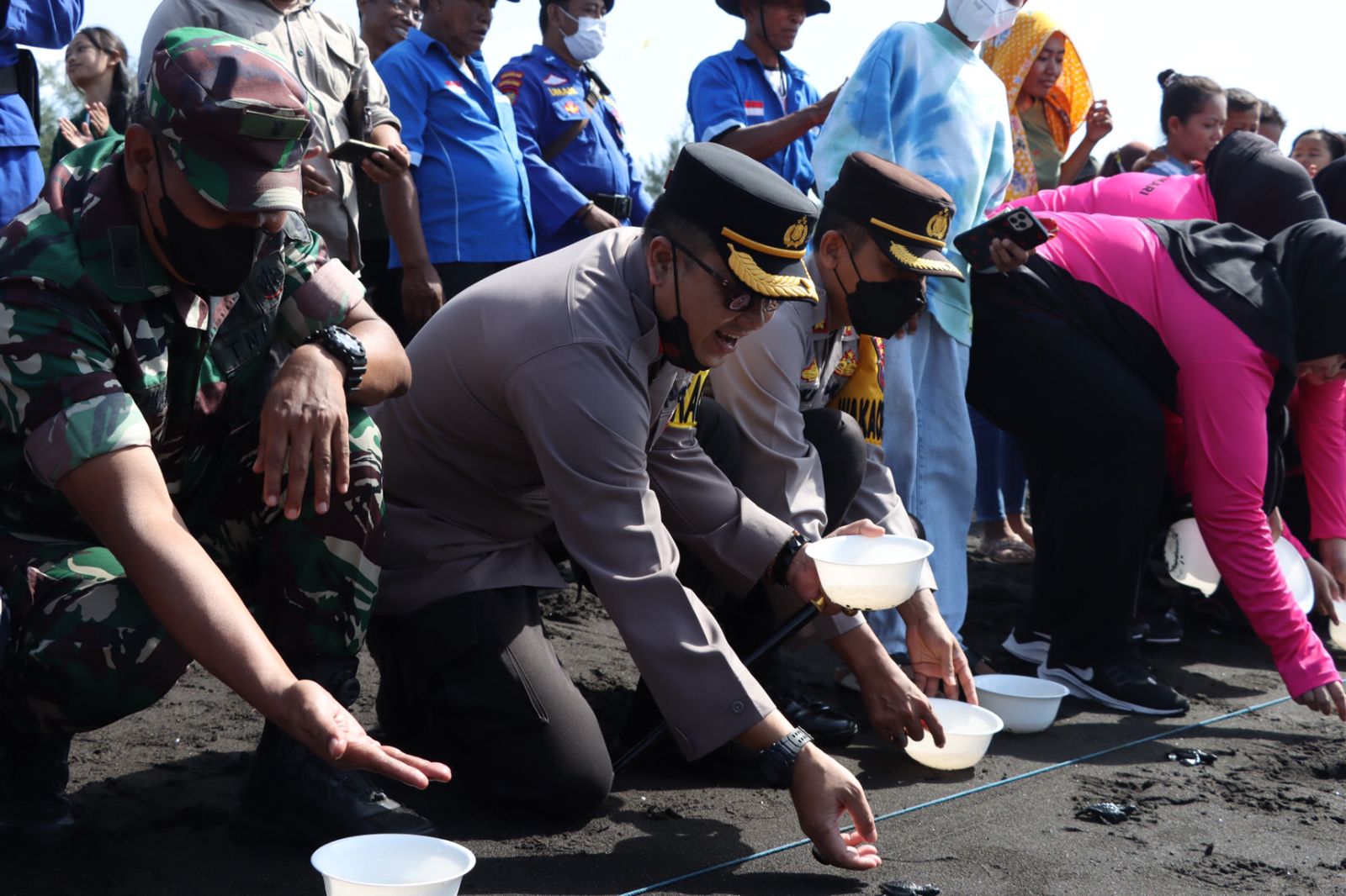 “Kita lepaskan 76 ekor tukik hasil penangkaran nelayan dan relawan. Ini rangkaian HUT Bayangkara ke 76,” kata Kapolresta Banyuwangi, AKBP Deddy Foury Millewa. Harapannya, tukik yang dilepaskan bisa mempertahankan ekosistem penyu di Selat Bali.