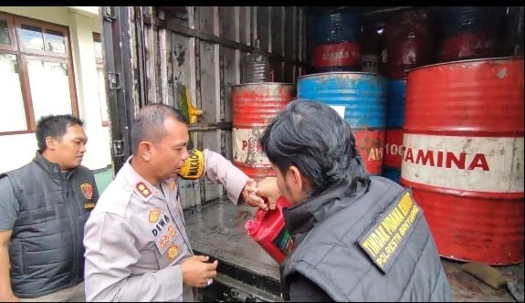 Polisi memeriksa solar subsidi yang ditimbun ditimbun secara ilegal, Selasa (18/7). (foto/udi)