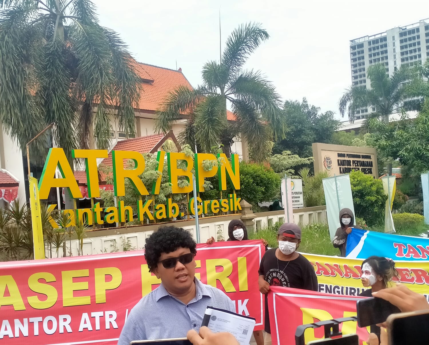 Dalam aksi di Gresik, Kamis (27/10) itu mereka menuntut Kepala ATR/BPN Gresik Asep Hery untuk segera menerbitkan sertifikat tanah atas nama Sueb Abdullah yang lokasinya berada di kawasan industri Manyar itu.