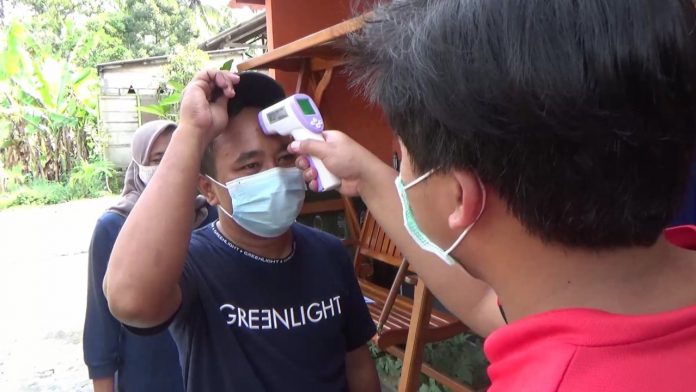 Pengunjung kuliner rujak soto di Songgon, Banyuwangi wajib cek suhu sebelum masuk ke warung, Jumat (17/9) siang. (budi wiriyanto)